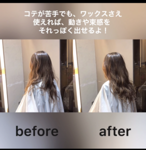 ワックスを馴染ませるだけで形になるように解説しています。コテが苦手な方でも、横と後ろ4つに分けて適当に巻くだけで大丈夫です。